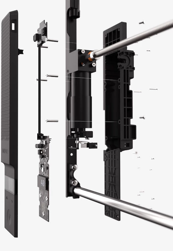 The strip on your MOVI Standing Desk has a purpose. It encloses our compact, 18V high-speed electric motor that offers fast and safe lifting, sit-stand controls, USB ports and move reminder.